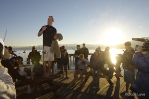Epic Way Sports’ Dr. Robb Gaffney MD addresses reporters and participants at the start of the Lake Tahoe Crossing on August 11th, 2008